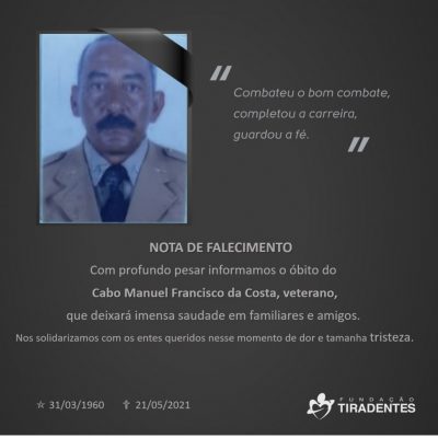 É com imenso pesar que a Fundação Tiradentes informa o falecimento do Cabo Manuel Francisco da Costa, veterano.